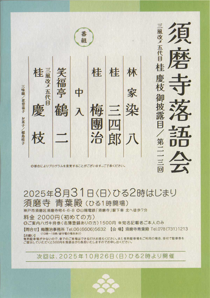 2025/07/31 須磨寺落語会 慶枝になって初めて出していただきました。 それもトリ出番で、ありがたい事です。 過去に2回出演してますが、正直表から入った事がありませんでした。 今回は、早めに楽屋入りしたので tagPlaceholderカテゴリ: 落語会 コメントをお書きください コメント: 0